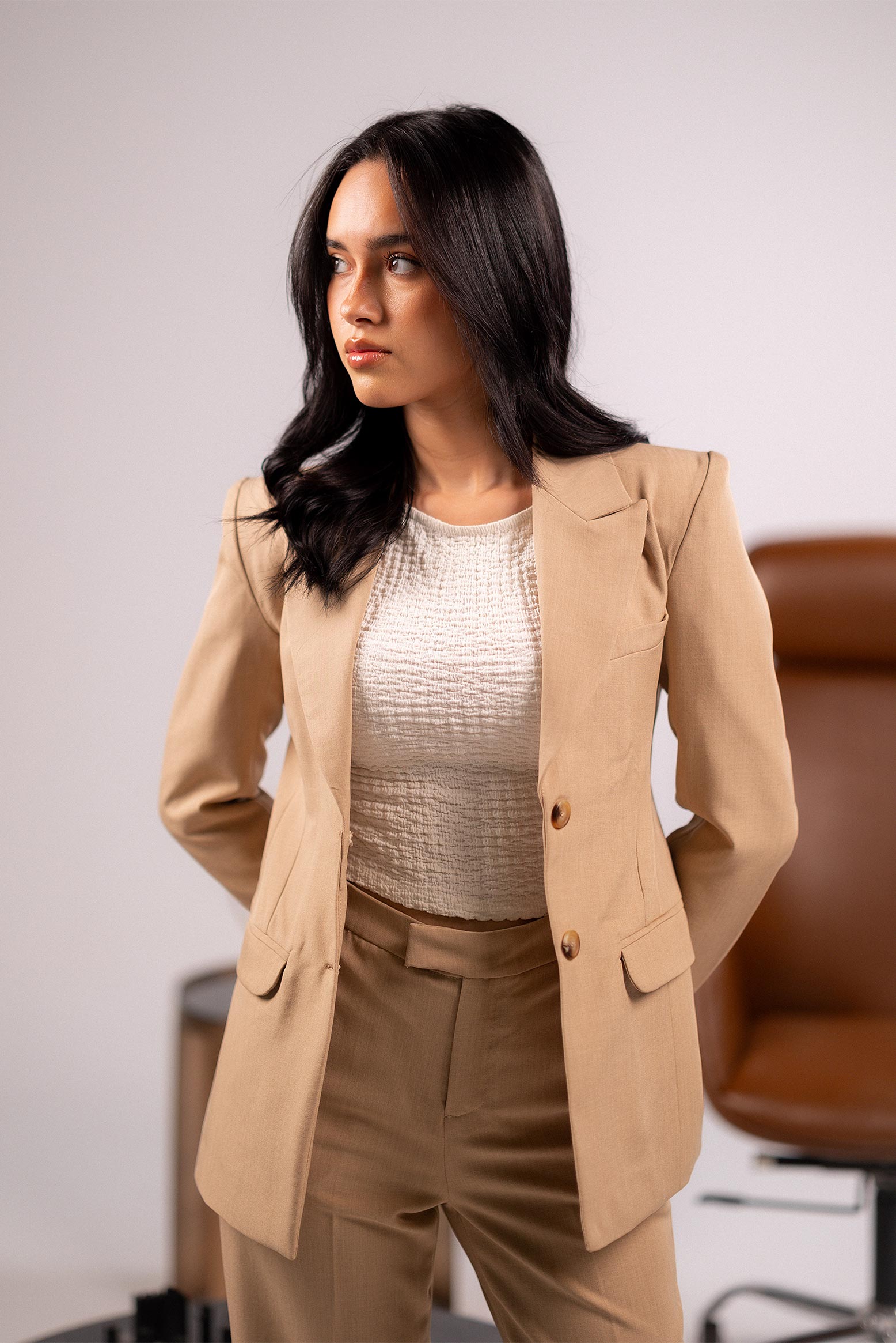 بدلة جريئة مع سترة متناسقة بأكمام طويلة وطول متوسط وأزرار أمامية. الكود :S5721 المادة: روزالين الطول : قصير تعليمات العناية: غسيل آلي على درجة حرارة 30 درجة مئوية/86 درجة فهرنهايت كحد أقصى مع دورة عصر قصيرة، لا تستخدم مبيضات، مكواة على درجة حرارة 110 درجة مئوية/230 درجة فهرنهايت كحد أقصى، لا تستخدم التنظيف الجاف، لا تستخدم المجفف