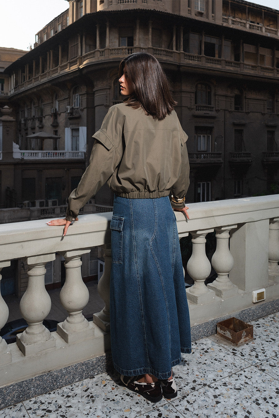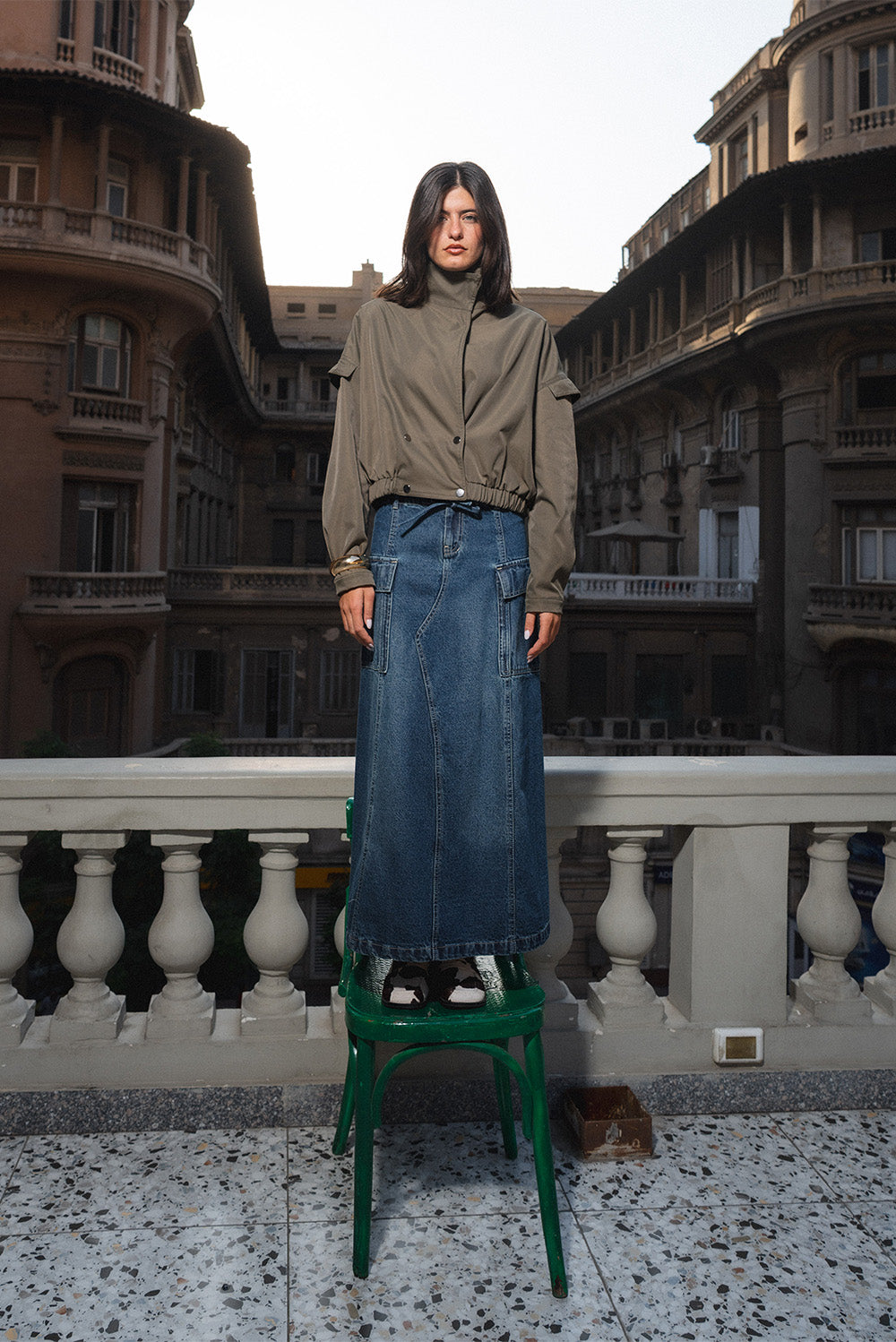 Lightweight jacket made from crisp cotton blend fabric. Features a high collar, elasticated hem, and relaxed fit with dropped shoulders for a structured yet casual cut