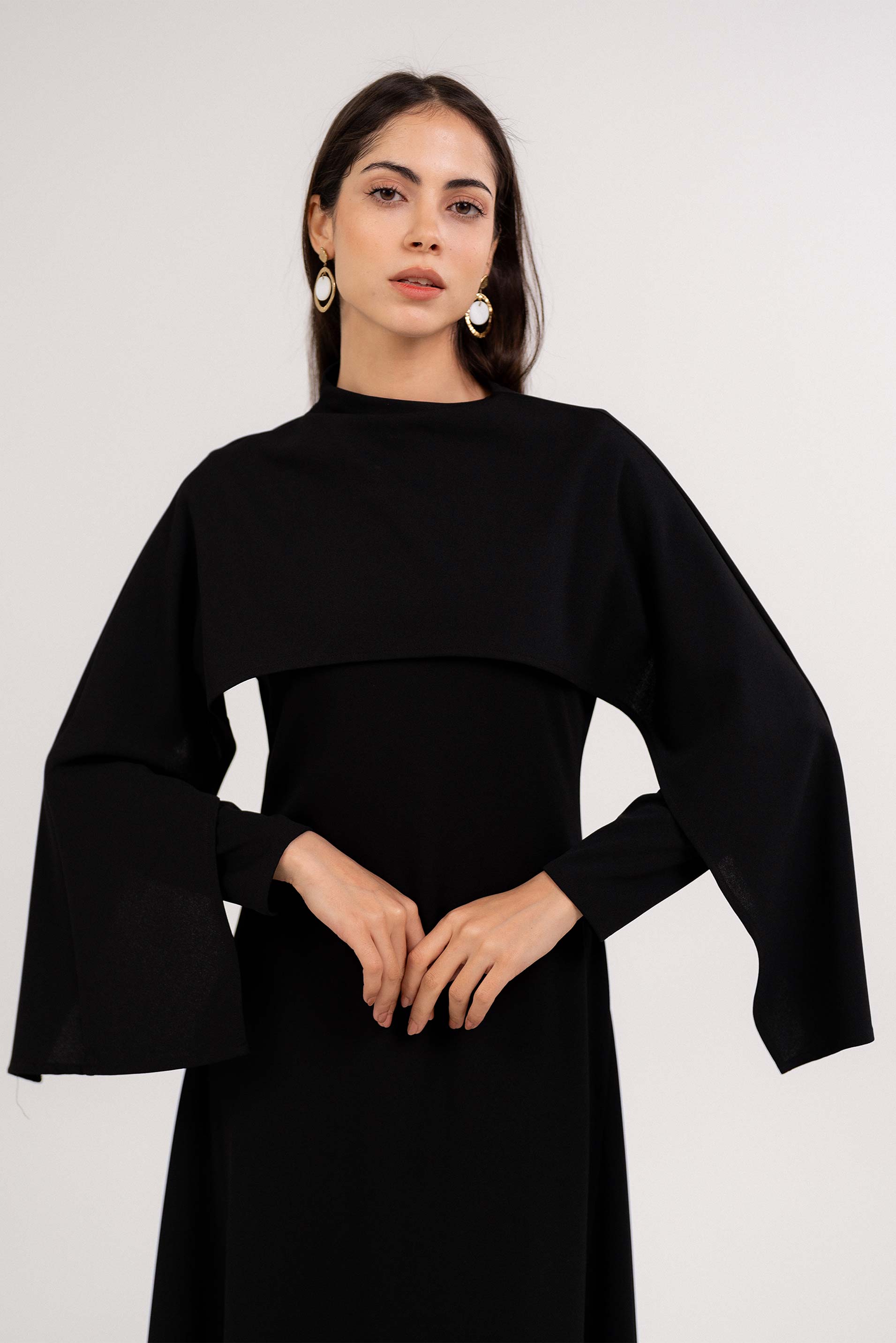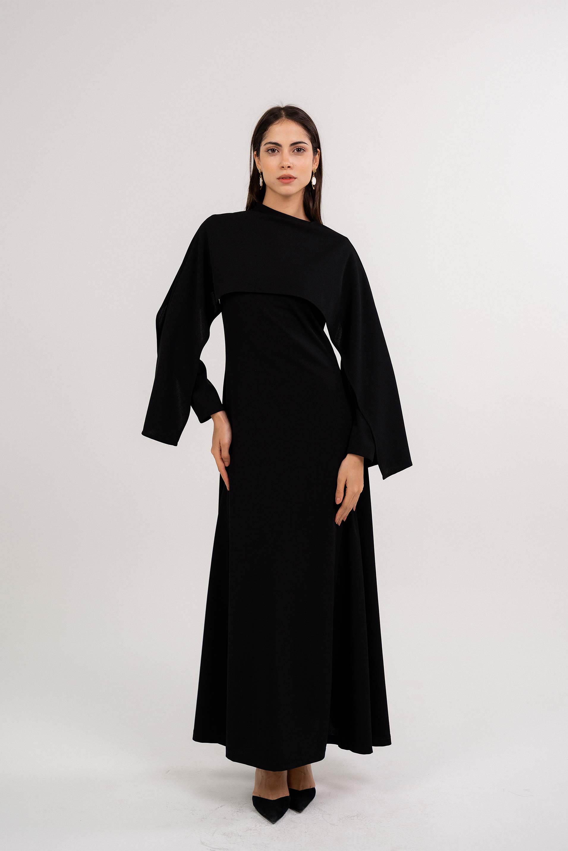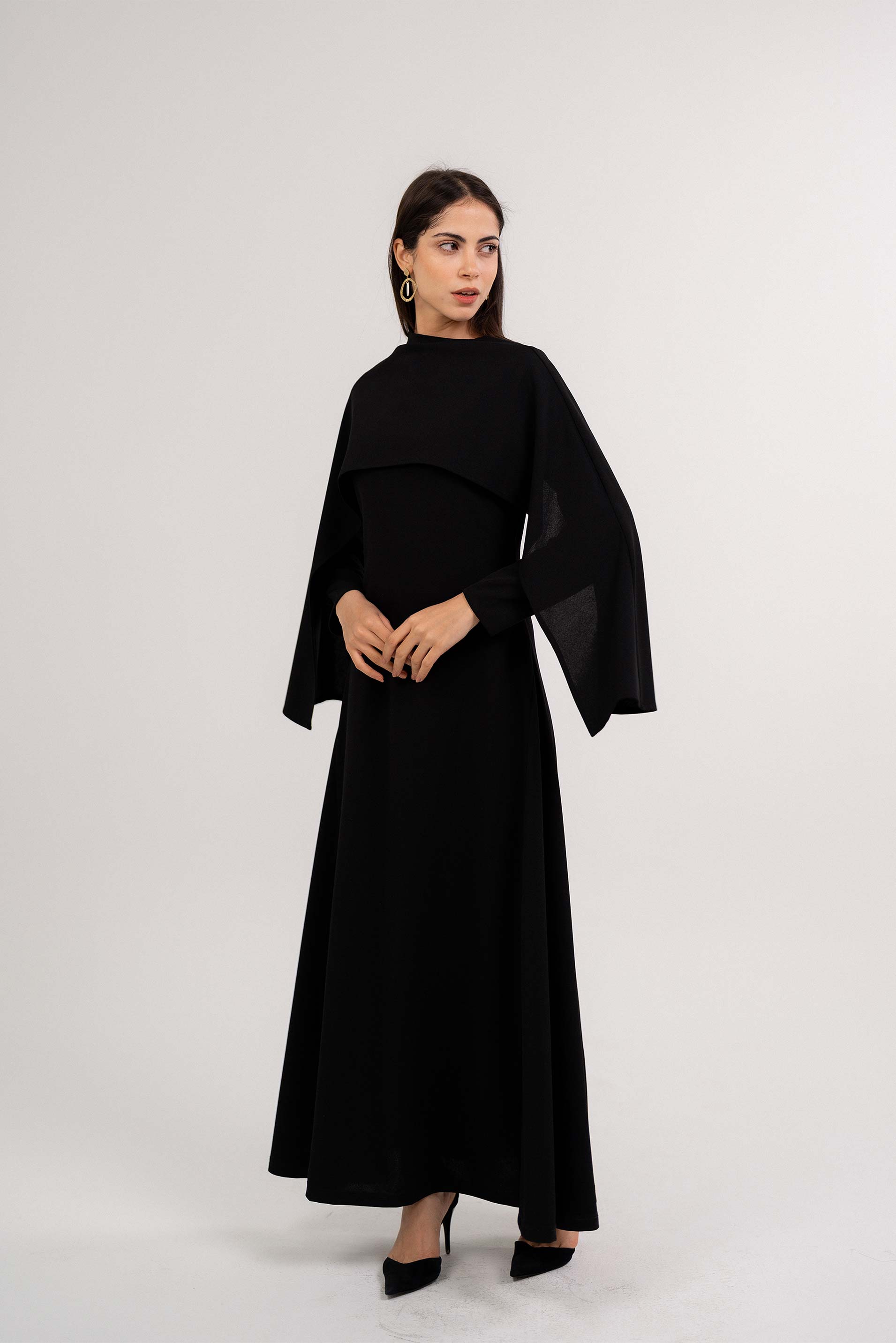 • فستان ذو عباءة على الكتف فستان ذو عباءة على الكتف