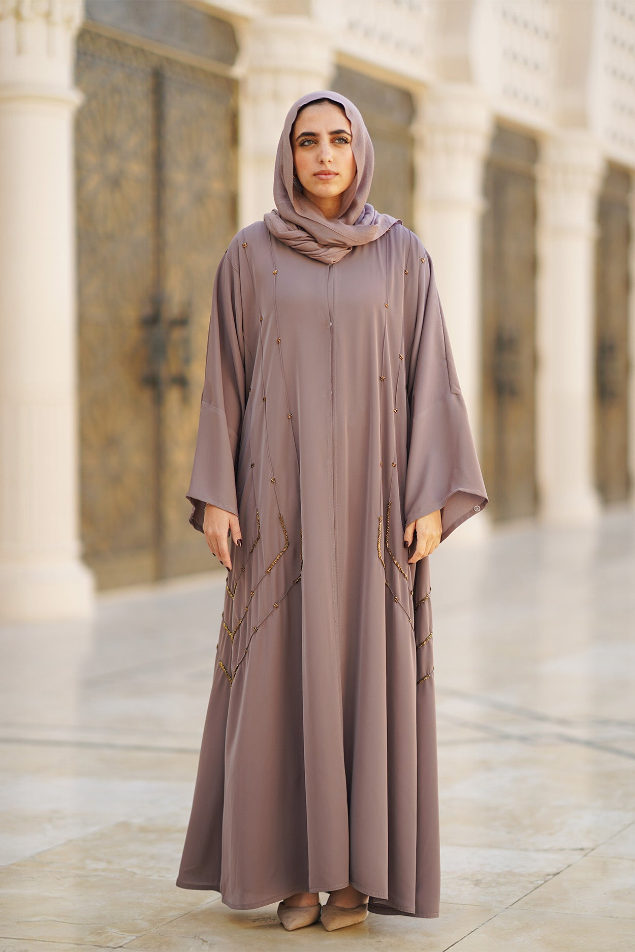 A full-length abaya crafted from a lightweight, fluid fabric that drapes effortlessly. Designed with wide, flowing sleeves for comfort and elegance. Features fine embroidered detailing placed along the front and lower sides.Code: B131Length : LongCare Instructions: Machine wash at max. 30ºC/86ºF with short spin cycle , Do not use bleach , Iron at a maximum of 110ºC/230ºF ,Do not dry clean ,Do not tumble dry