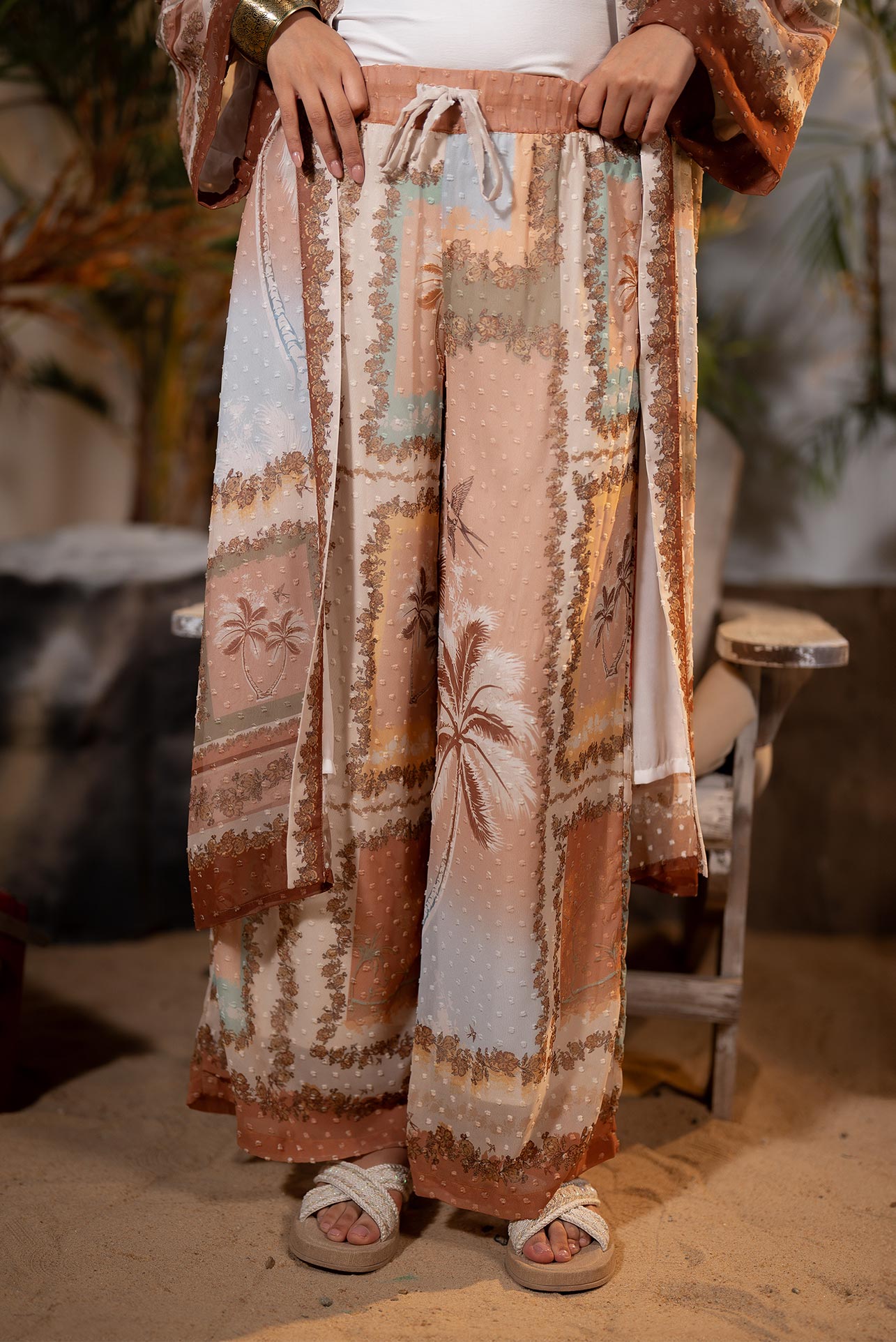 بنطلون واسع من الشيفون بنقشة النخيل، وليس شفافًا.