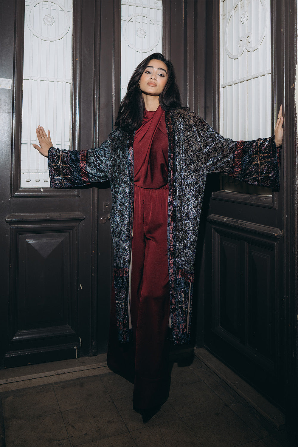 A statement long cardigan crafted from soft velvet with a rich textured pattern. Designed with an open front and straight cut for easy layering. Features subtle contrast detailing along the edges and a relaxed, fluid fit.Code: S6104Material :VelvetLength : LongCare Instructions: Machine wash at max. 30ºC/86ºF with short spin cycle , Do not use bleach , Iron at a maximum of 110ºC/230ºF ,Do not dry clean ,Do not tumble dry