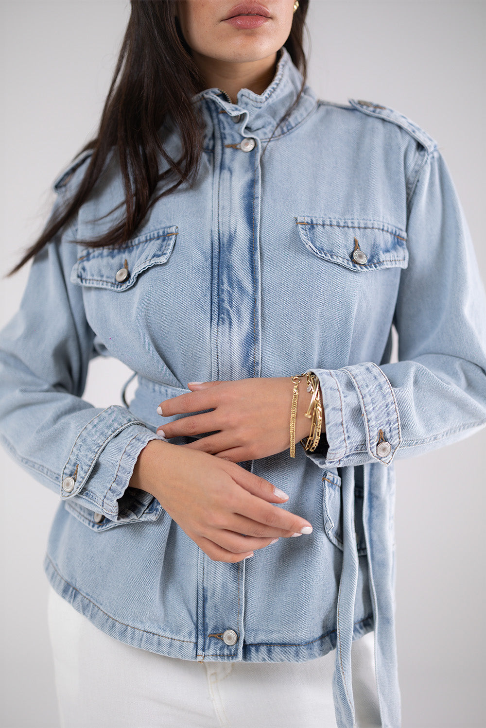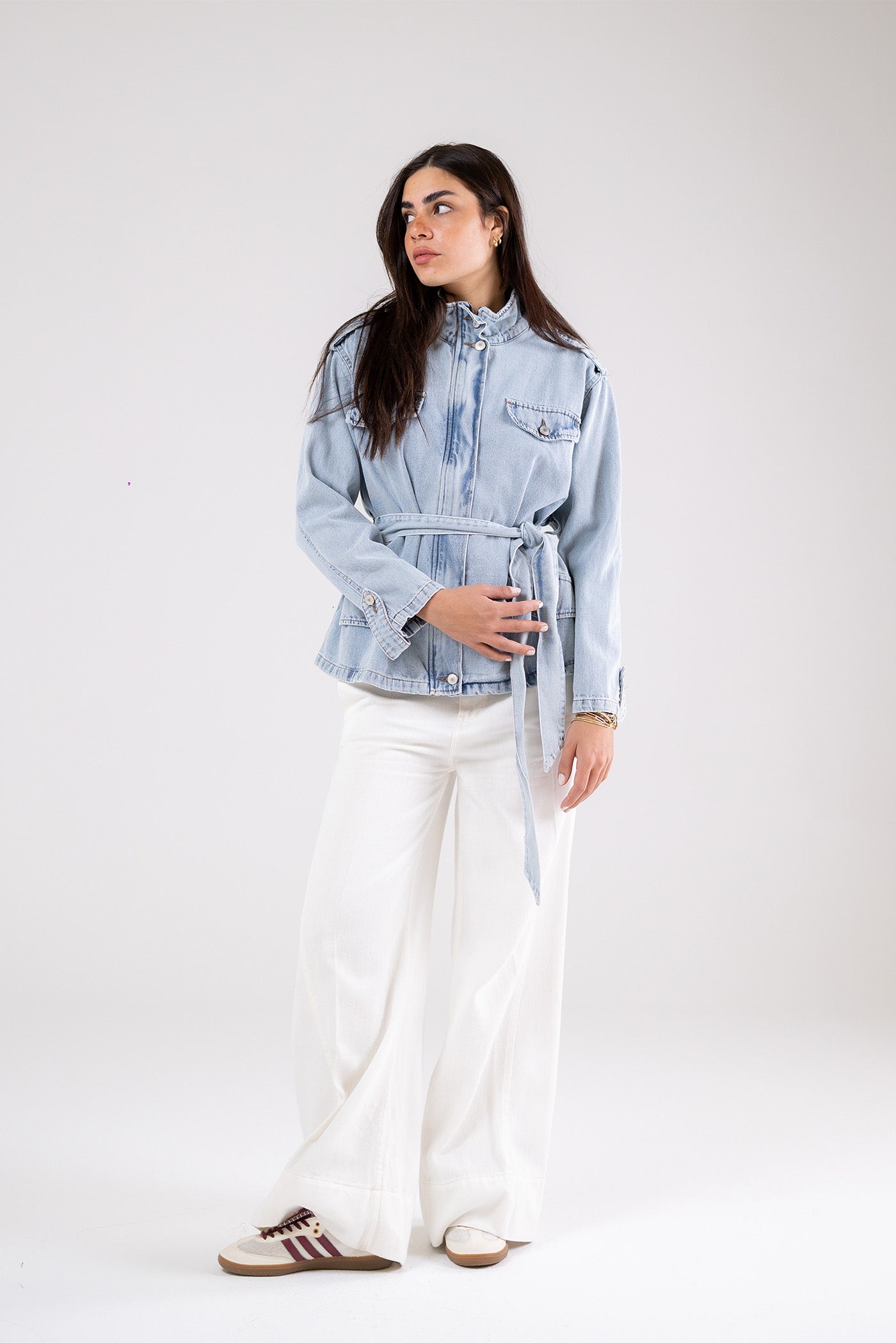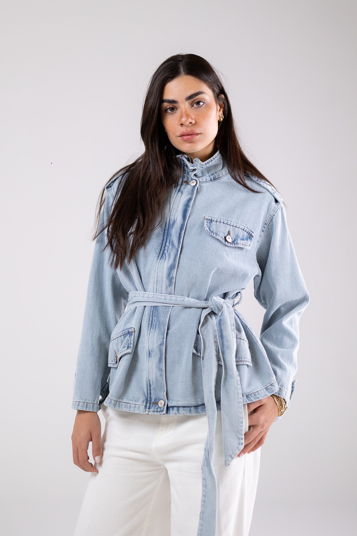 A lightweight denim jacket made from soft, breathable cotton denim. Designed in a relaxed straight cut with long sleeves and a slightly cropped length. It features front buttons, chest pockets, and a tie belt at the waist for a flattering shape.Code: S6097 Material :DenimLength : RegularCare Instructions: Machine wash at max. 30ºC/86ºF with short spin cycle , Do not use bleach , Iron at a maximum of 110ºC/230ºF ,Do not dry clean ,Do not tumble dry
