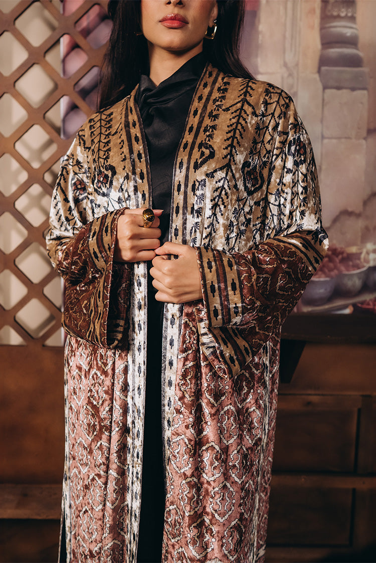 This kimono features an intricate all-over print that adds depth, texture.Designed with a fluid silhouette and open-front style, it drapes beautifully over dresses or tailored separates, making it perfect for both day-to-evening wear.Code: S6098Material :VelvetLength : LongCare Instructions: Machine wash at max. 30ºC/86ºF with short spin cycle , Do not use bleach , Iron at a maximum of 110ºC/230ºF ,Do not dry clean ,Do not tumble dry