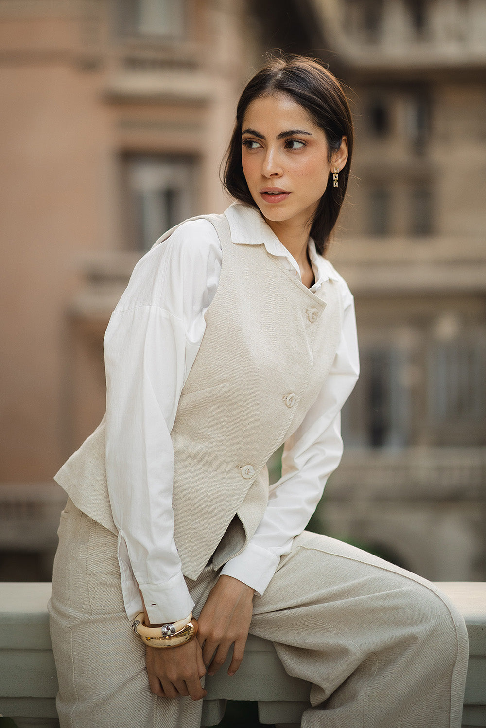 Structured vest made from smooth, heavyweight fabric with a sharp V-neckline and wide shoulders. Features a wrap-style front and contrast printed belt for a defined waist and modern silhouette.Code :80511Material :Crepe Length : Regular Care Instructions: Machine wash at max. 30ºC/86ºF with short spin cycle , Do not use bleach , Iron at a maximum of 110ºC/230ºF ,Do not dry clean ,Do not tumble dry