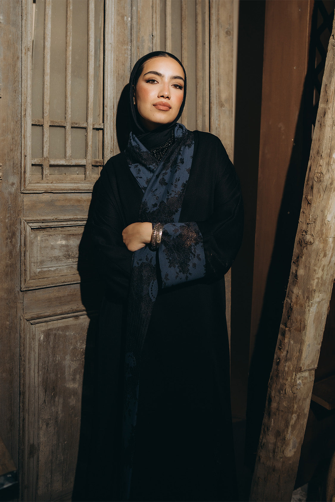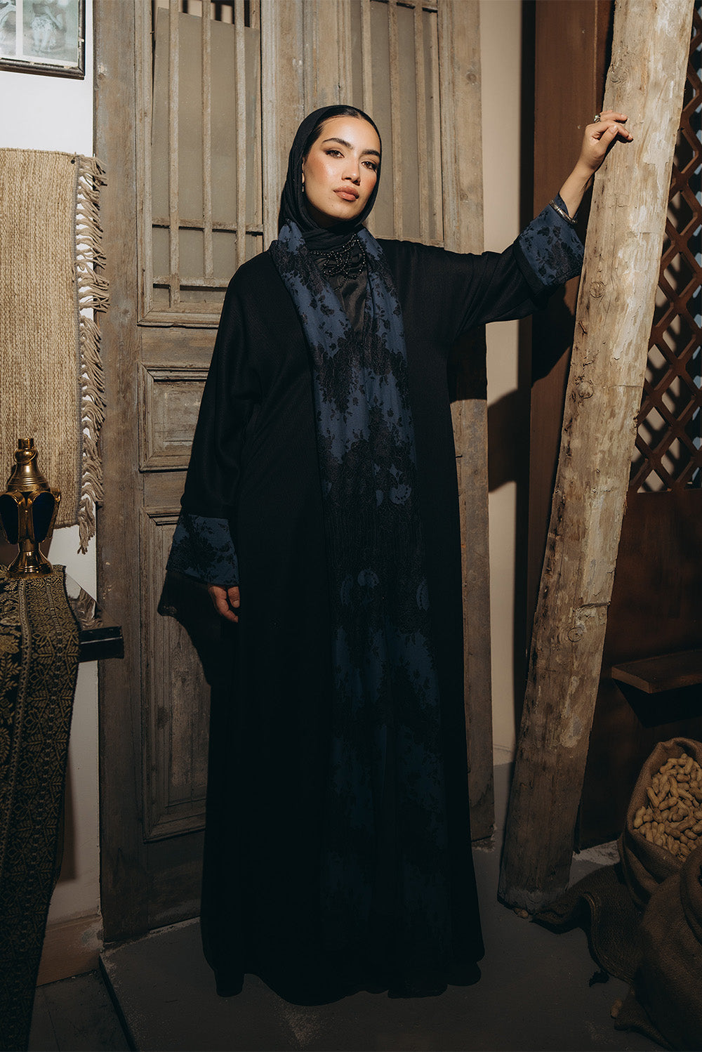 This elegant floor‑length abaya features wide long sleeves for a graceful silhouette and a distinctive bluish collar and sleeves cuff, accented with delicate black lace pattern. A refined blend of modesty and modern style, perfect for special occasions or elevated everyday wear.Code: B158Material :SilkLength : RegularCare Instructions: Machine wash at max. 30ºC/86ºF with short spin cycle , Do not use bleach , Iron at a maximum of 110ºC/230ºF ,Do not dry clean ,Do not tumble dry