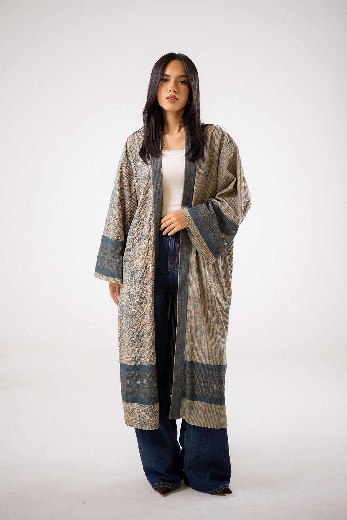This elegant long cardigan is made from a soft, textured knit fabric featuring a beautiful vintage-inspired pattern. It is designed with an open front and wide, relaxed sleeves that give it a comfortable and flowing style. The neutral earth tones and floor-length cut make it an easy and stylish way to dress up a simple t-shirt and jeans.Code : 80563Material :VelvetLength : Regular Care Instructions: Machine wash at max. 30ºC/86ºF with short spin cycle , Do not use bleach , Iron at a maximum of 110ºC/230ºF ,Do not dry clean ,Do not tumble dry