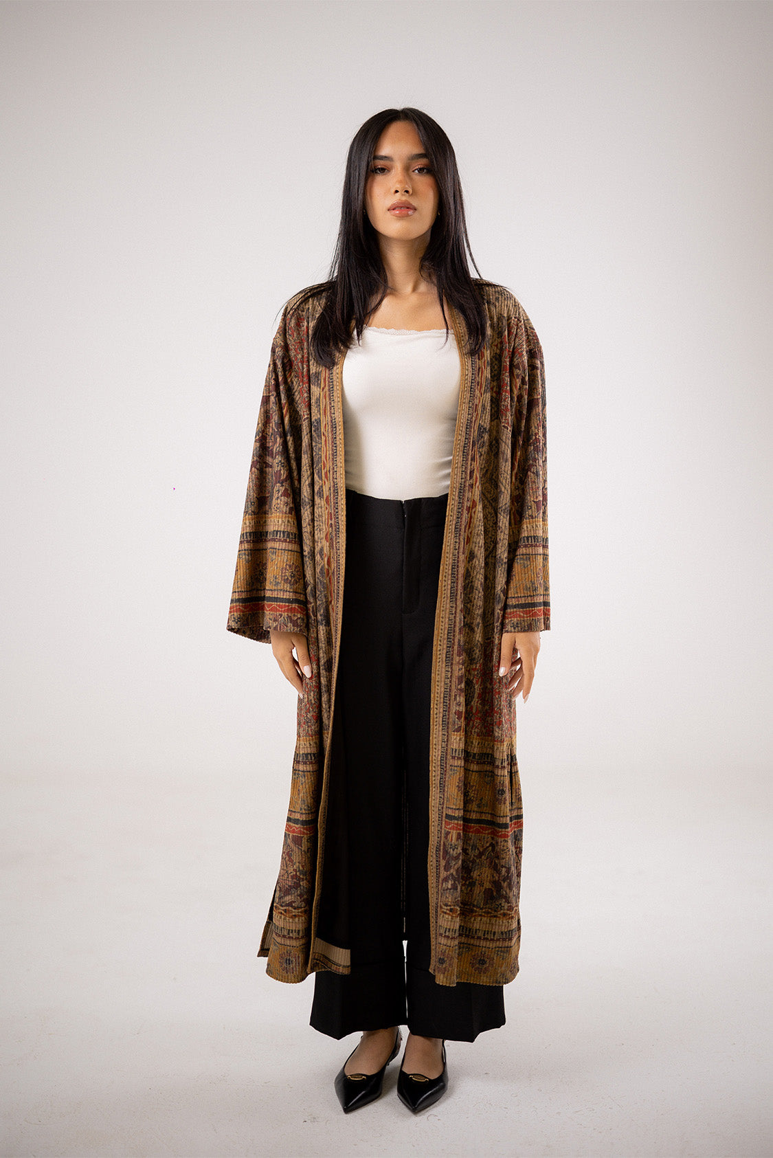 This stunning kimono is made from a soft, textured fabric with a rich, detailed pattern in warm brown tones. It features an open-front design and extra-wide sleeves that create a beautiful, flowing shape as you move. This lightweight layer is perfect for adding a sophisticated and artistic touch to a simple top and trousers.Code : 80565Material :VelvetLength : Regular Care Instructions: Machine wash at max. 30ºC/86ºF with short spin cycle , Do not use bleach , Iron at a maximum of 110ºC/230ºF ,Do not dry clean ,Do not tumble dry