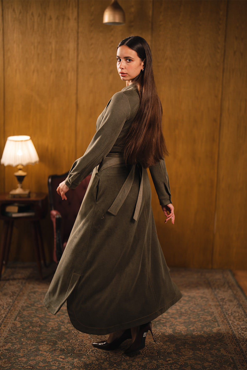 A soft, suede textured dress, featuring a subtle V-neck, long sleeves, and a front knot that shapes the waist. The maxi-length cut drapes smoothly for a relaxed yet structured fit, with discreet side pockets for added refinementCode :80540Material :Suede Length : Regular Care Instructions: Machine wash at max. 30ºC/86ºF with short spin cycle , Do not use bleach , Iron at a maximum of 110ºC/230ºF ,Do not dry clean ,Do not tumble dry