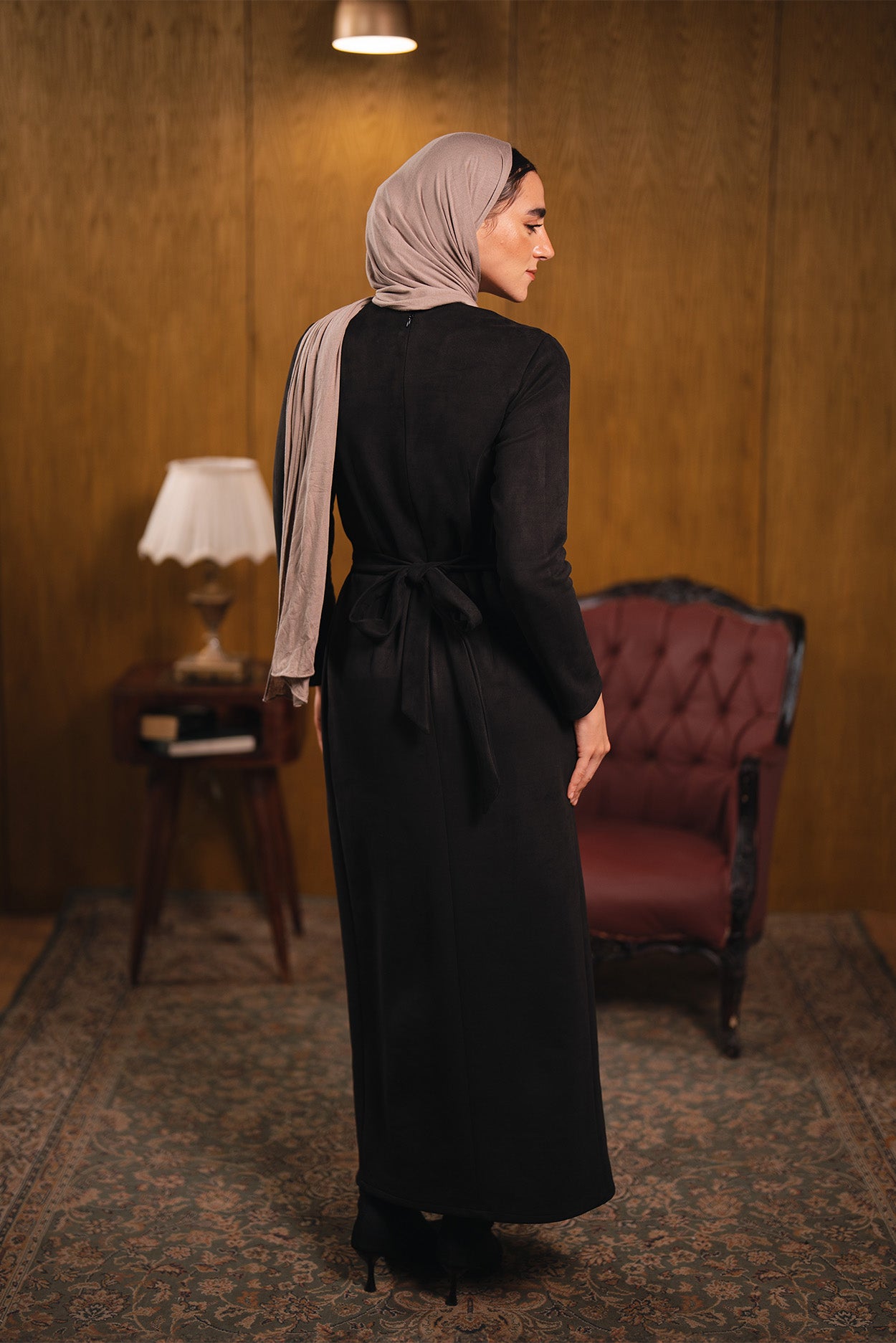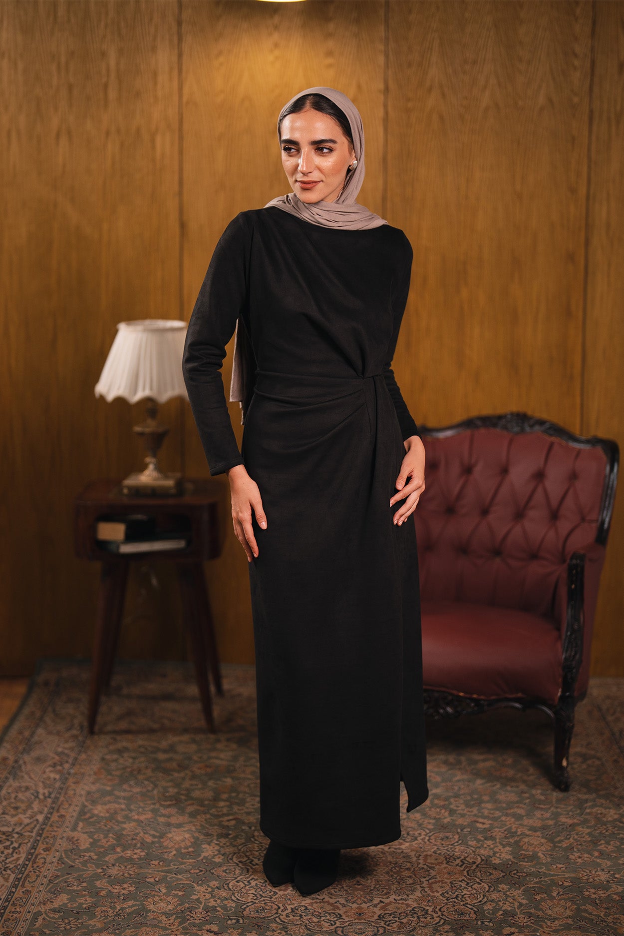 A soft, suede textured dress, featuring a round neck, long sleeves, with upper sided drapes that shapes the waist. The maxi straight length cut drapes smoothly for a relaxed yet structured fit.Code :80555Material :Suede Length : Regular Care Instructions: Machine wash at max. 30ºC/86ºF with short spin cycle , Do not use bleach , Iron at a maximum of 110ºC/230ºF ,Do not dry clean ,Do not tumble dry