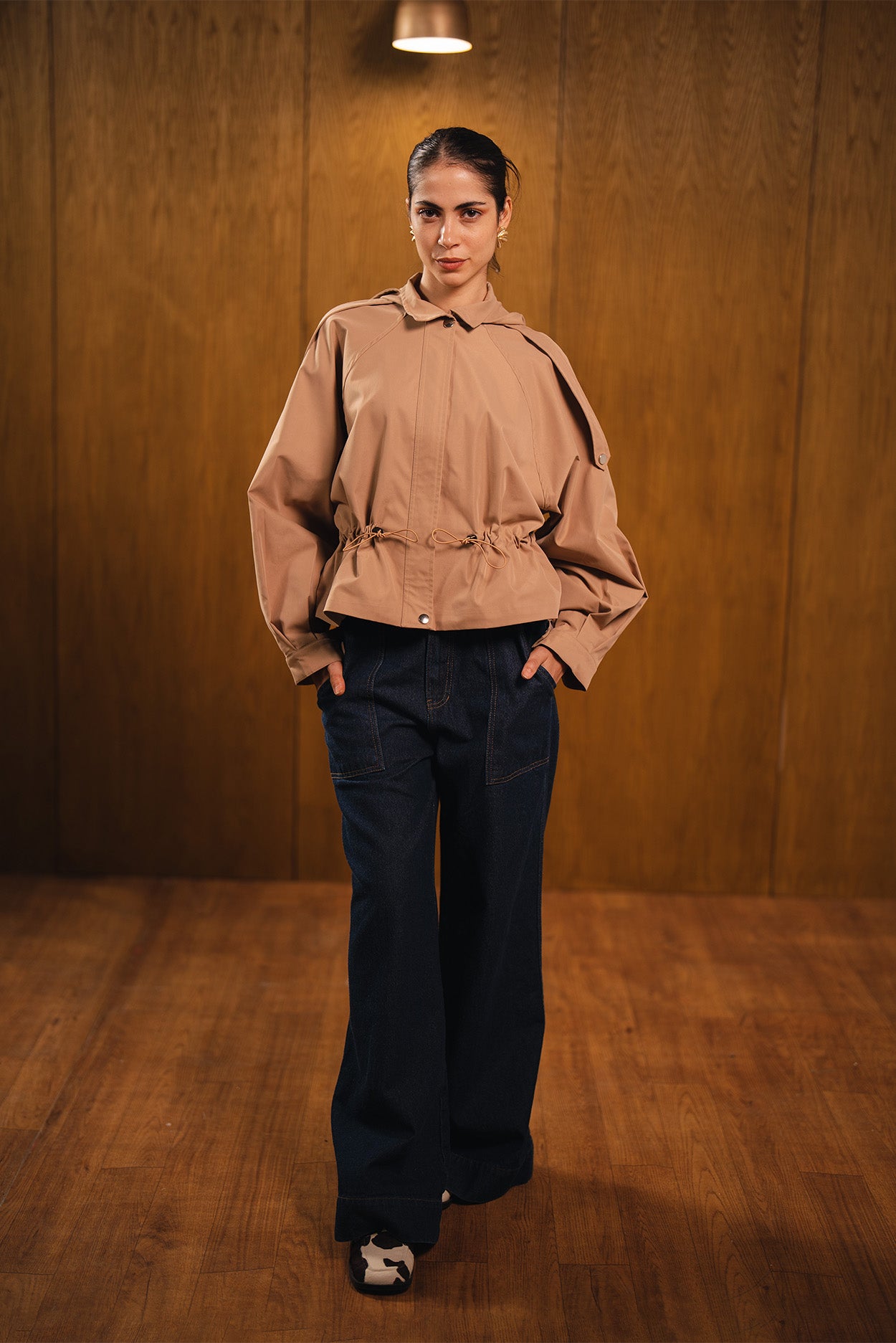 Lightweight taupe fabric with structured stitching, a high collar, and adjustable drawstring waist. The cut is relaxed with a slightly cropped, rounded silhouette.Code :80459Material :GabardineLength : ShortCare Instructions: Machine wash at max. 30ºC/86ºF with short spin cycle , Do not use bleach , Iron at a maximum of 110ºC/230ºF ,Do not dry clean ,Do not tumble dry