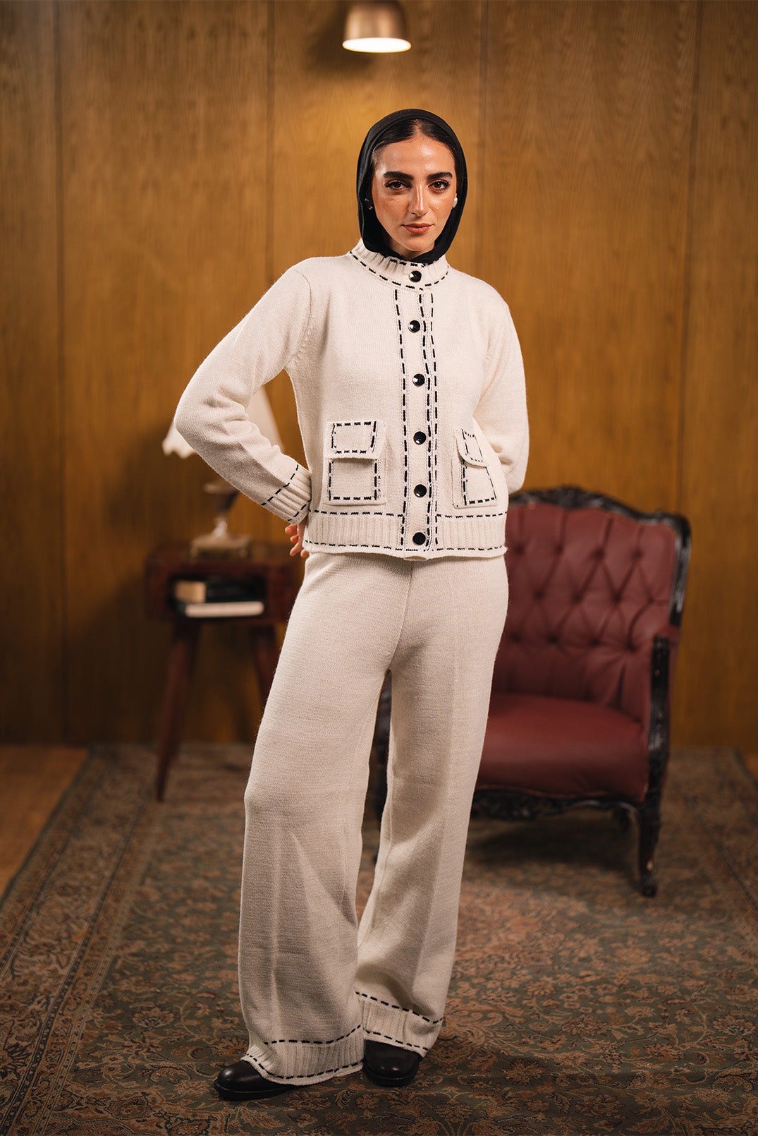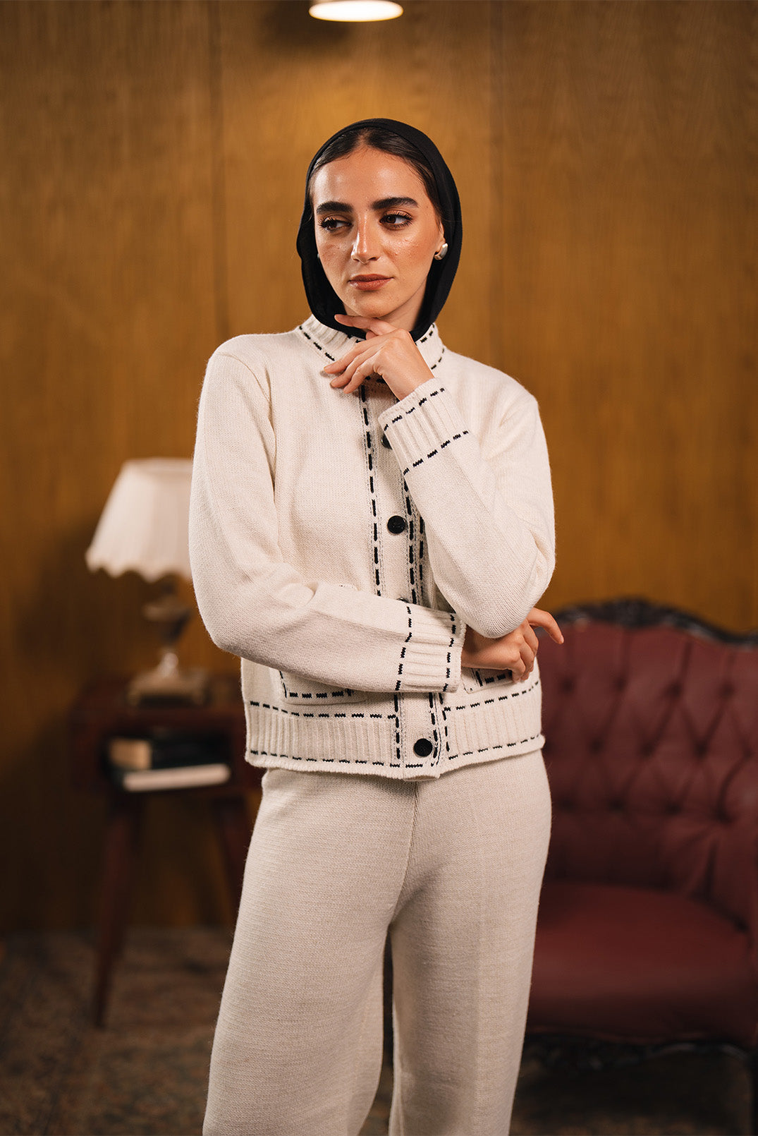 Soft cream knit with black contrast stitching, featuring a high collar, front buttons, and patch pockets. The cut is relaxed with a straight, comfortable fit.Code :T1055Material :KnitLength : ShortCare Instructions: Machine wash at max. 30ºC/86ºF with short spin cycle , Do not use bleach , Iron at a maximum of 110ºC/230ºF ,Do not dry clean ,Do not tumble dry