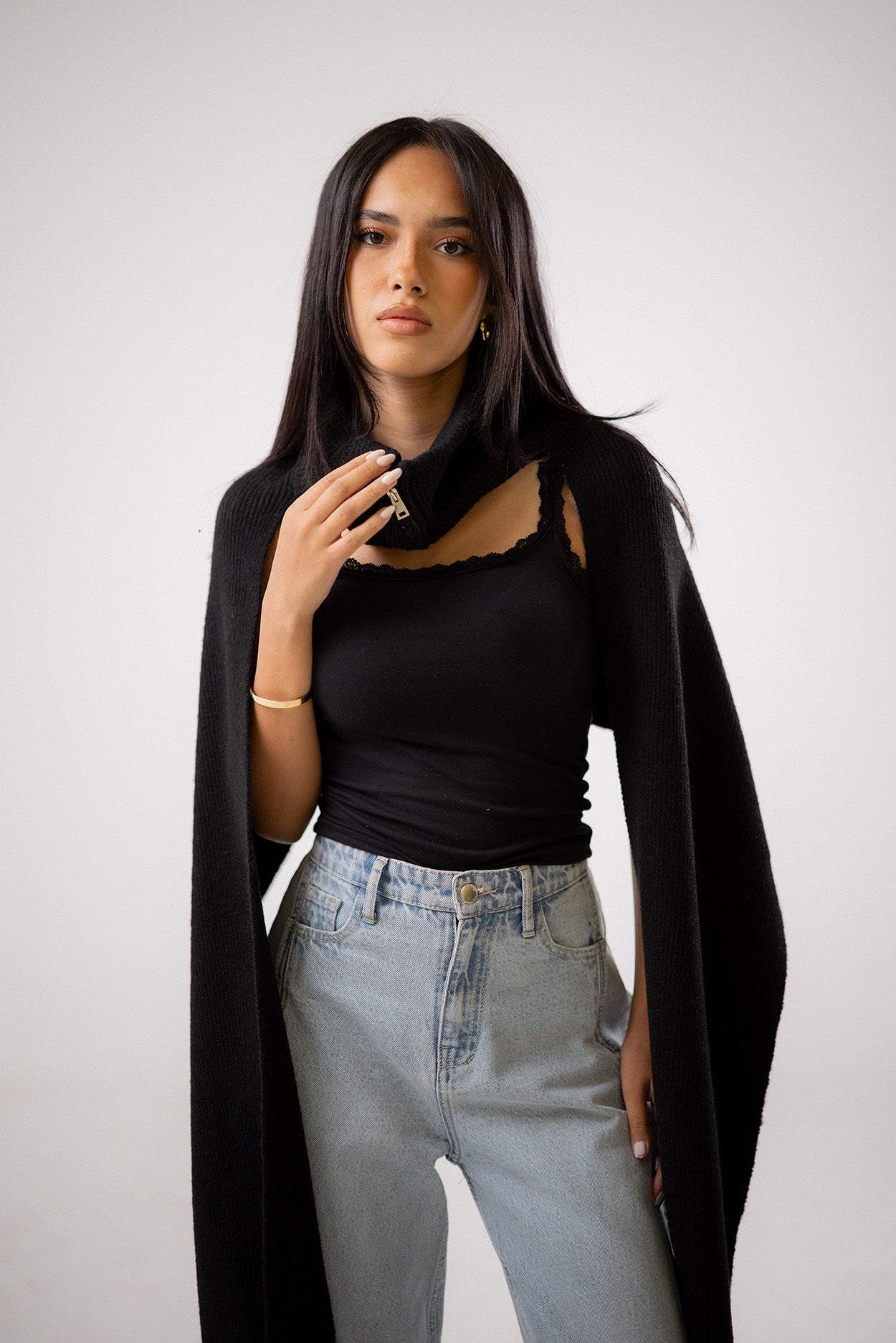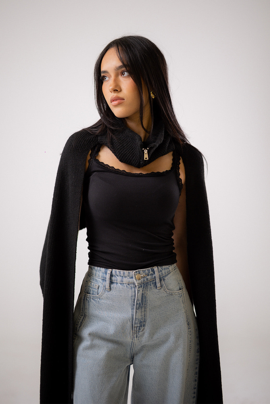 Made from plush ribbed knit fabric, this heather gray shawl features a sleek zipper closure at the neck for adjustable styling. Its long, flowing cut offers both warmth and a modern, sculptural silhouette.CODE:T1046