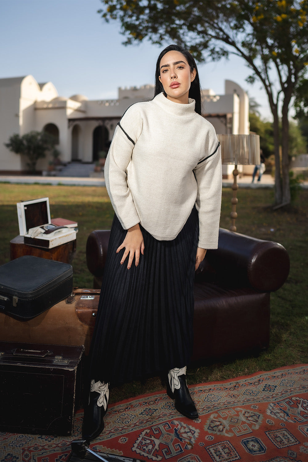 A refined high-neck knit sweater designed with a relaxed silhouette for effortless elegance. Crafted from a soft, textured fabric, it offers warmth without bulk. Subtle contrast piping along the sleeves adds a modern touch, making it perfect for both casual and elevated looks.Code : T1062Material :KnitLength : LongCare Instructions: Machine wash at max. 30ºC/86ºF with short spin cycle , Do not use bleach , Iron at a maximum of 110ºC/230ºF ,Do not dry clean ,Do not tumble dry