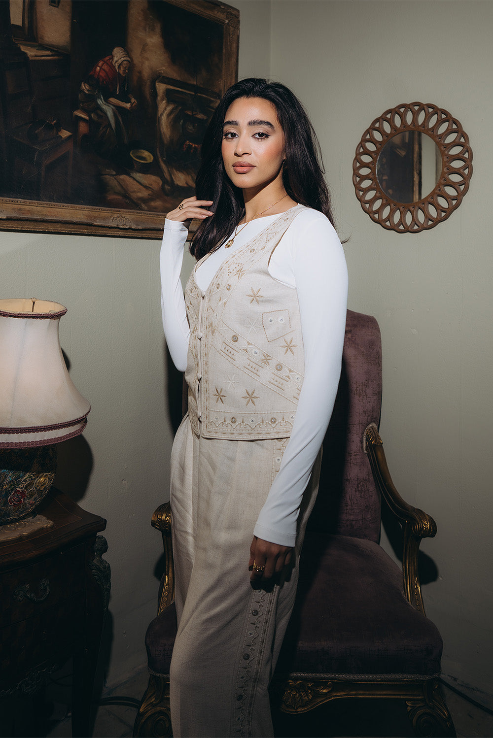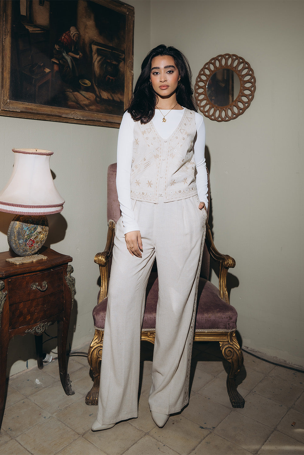 A lightweight Lenin vest designed with delicate embroidered motifs throughout. Features a V-neckline and button-down front for a clean, tailored look. The cut is straight with a relaxed fit, making it easy to layer. Finished in a soft neutral tone that adds subtle texture and detail.Code: S5852Material :LeninLength : ShortCare Instructions: Machine wash at max. 30ºC/86ºF with short spin cycle , Do not use bleach , Iron at a maximum of 110ºC/230ºF ,Do not dry clean ,Do not tumble dry