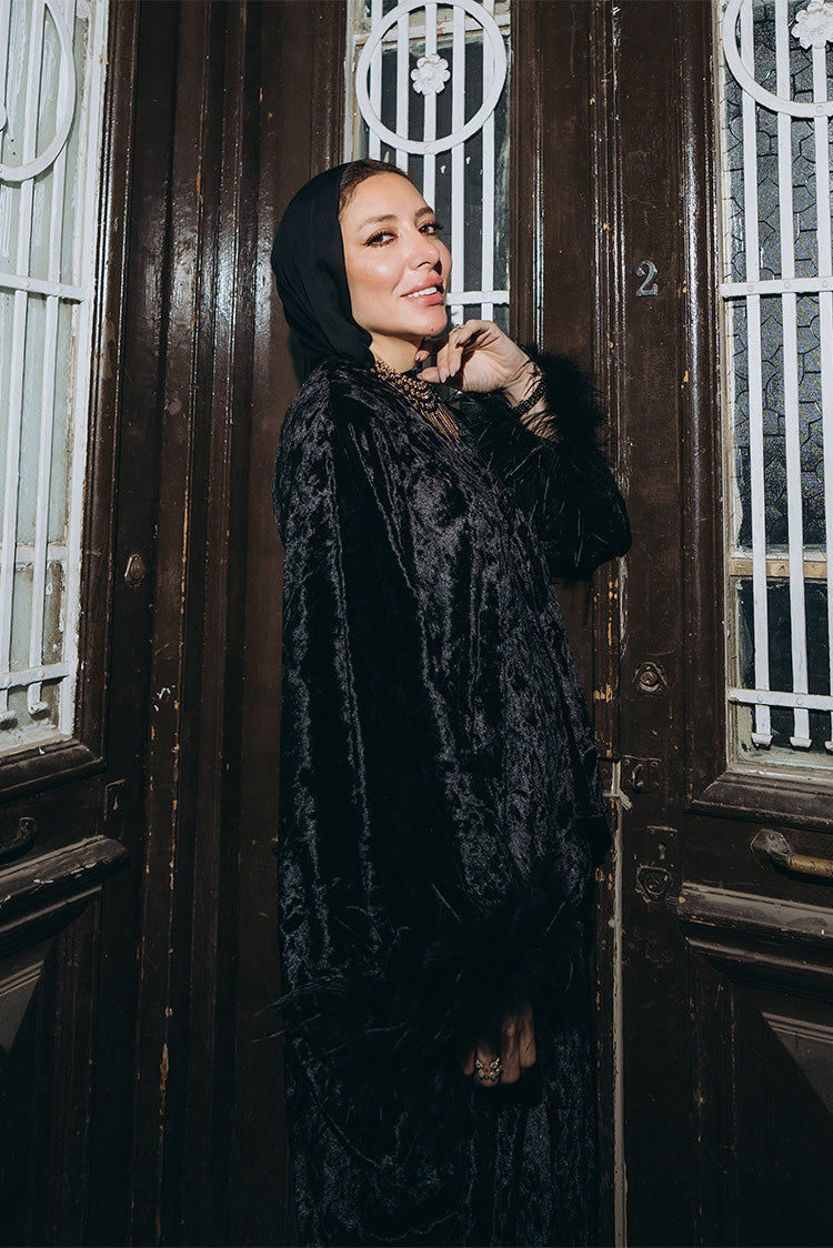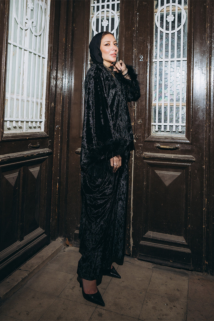 This velvet top features a modern side cut with a short front and a floor-length back. The design creates a soft flow while keeping a structured shape. Fur-leather detailing finishes the hem for added texture and contrast. The long sleeves are completed with fur-leather cuffs, giving the top a polished, elevated look.Code: S6061Material :VelvetLength : RegularCare Instructions: Machine wash at max. 30ºC/86ºF with short spin cycle , Do not use bleach , Iron at a maximum of 110ºC/230ºF ,Do not dry clean ,Do not tumble dry