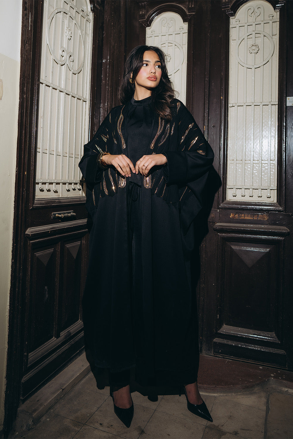 A full-length open abaya featuring a loose, flowing cape silhouette with wide sleeves. Vertical metallic sequin detailing across the front and sleeves adds subtle shimmer and movement, creating a bold yet elegant look. Crafted from a soft, fluid fabric with a gentle sheen for effortless drape and presence.Code: B161Material : Silk CrepeLength : LongCare Instructions: Machine wash at max. 30ºC/86ºF with short spin cycle , Do not use bleach , Iron at a maximum of 110ºC/230ºF ,Do not dry clean ,Do not tumble dry