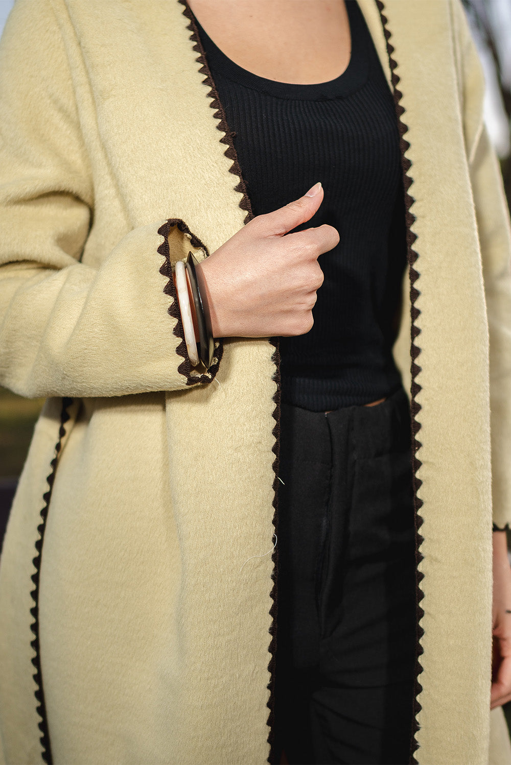 Warm coat made from a soft, textured fabric, detailed with contrast stitched trim along the collar, front edges, sleeves, and hem. Features a wide shawl-style collar, self-tie belt, & in knee-length.Code :80486Material :WoolLength : RegularCare Instructions: Machine wash at max. 30ºC/86ºF with short spin cycle , Do not use bleach , Iron at a maximum of 110ºC/230ºF ,Do not dry clean ,Do not tumble dry
