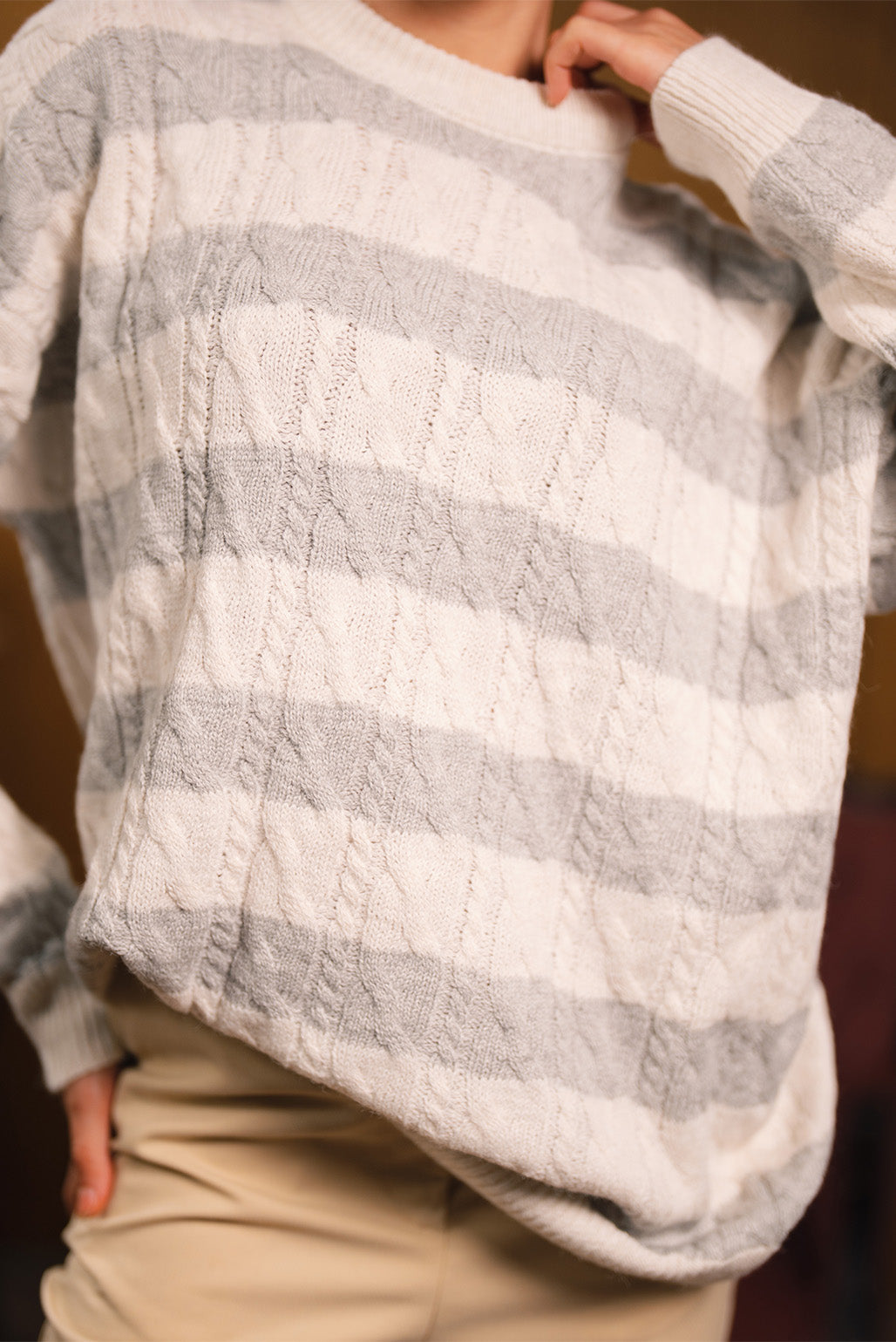 A soft, mid weight knit sweater featuring horizontal light grey and white stripes. Made from a cozy, textured yarn with subtle cable inspired detailing. Designed with a relaxed, slightly oversized fit and ribbed cuffs and hem.Code :T1043Material :KnitLength : RegularCare Instructions: Machine wash at max. 30ºC/86ºF with short spin cycle , Do not use bleach , Iron at a maximum of 110ºC/230ºF ,Do not dry clean ,Do not tumble dry