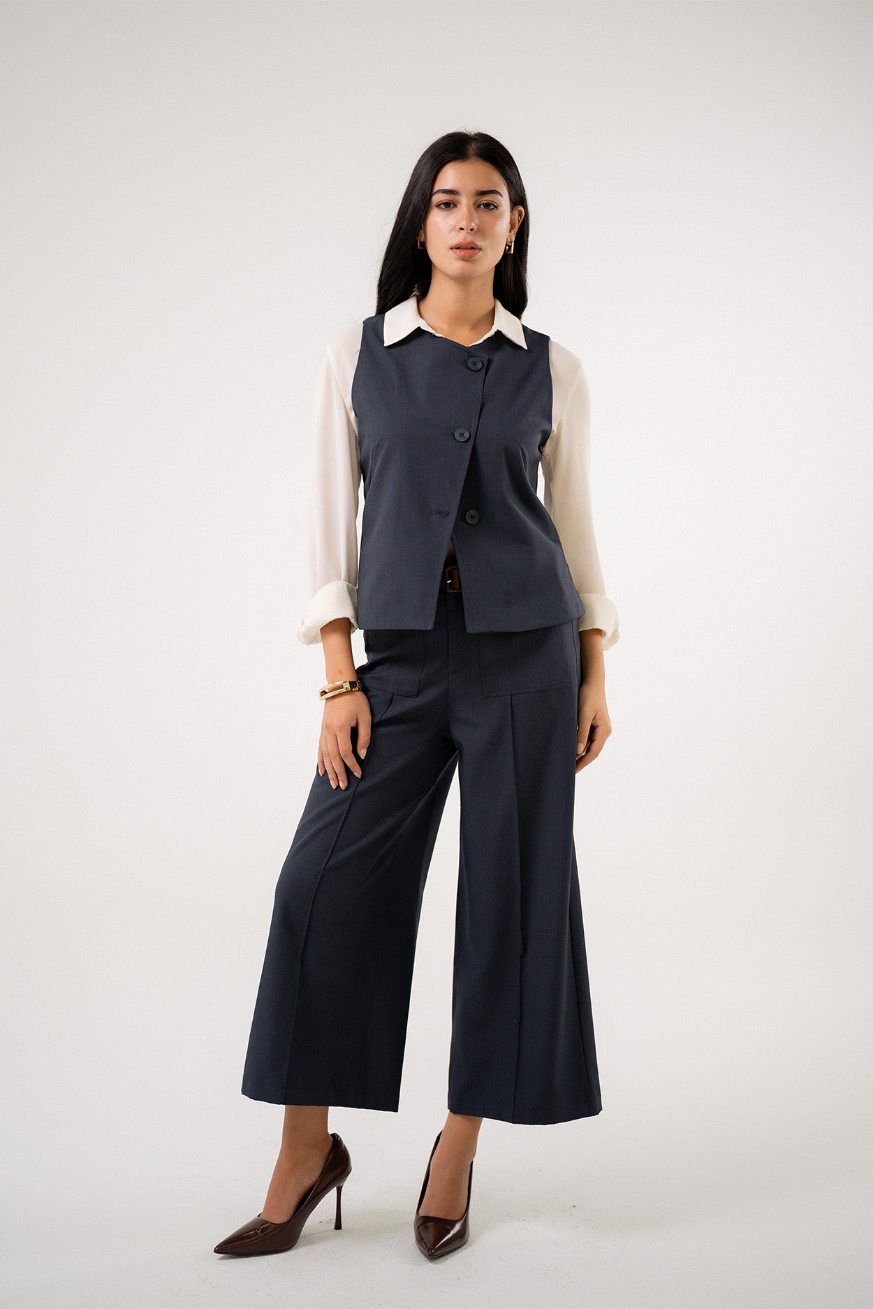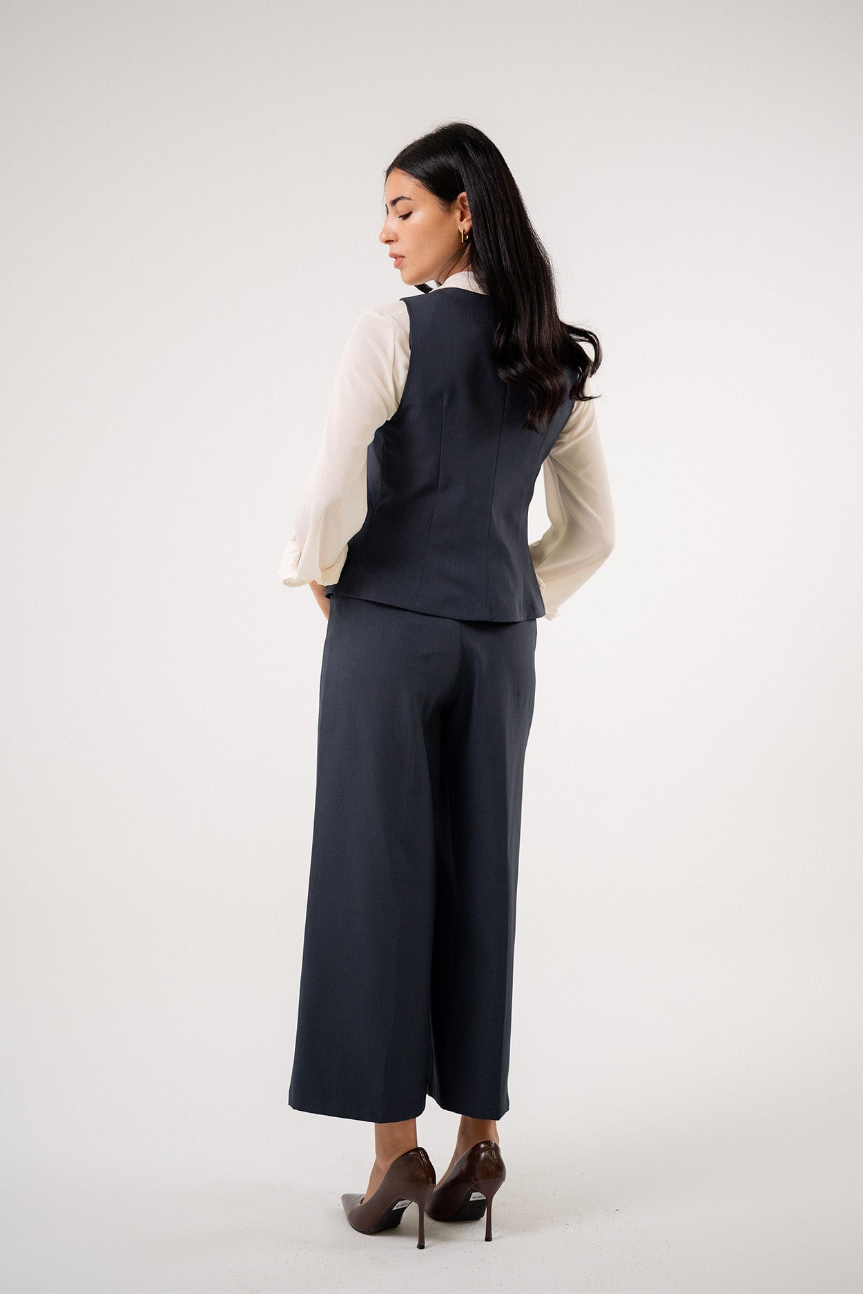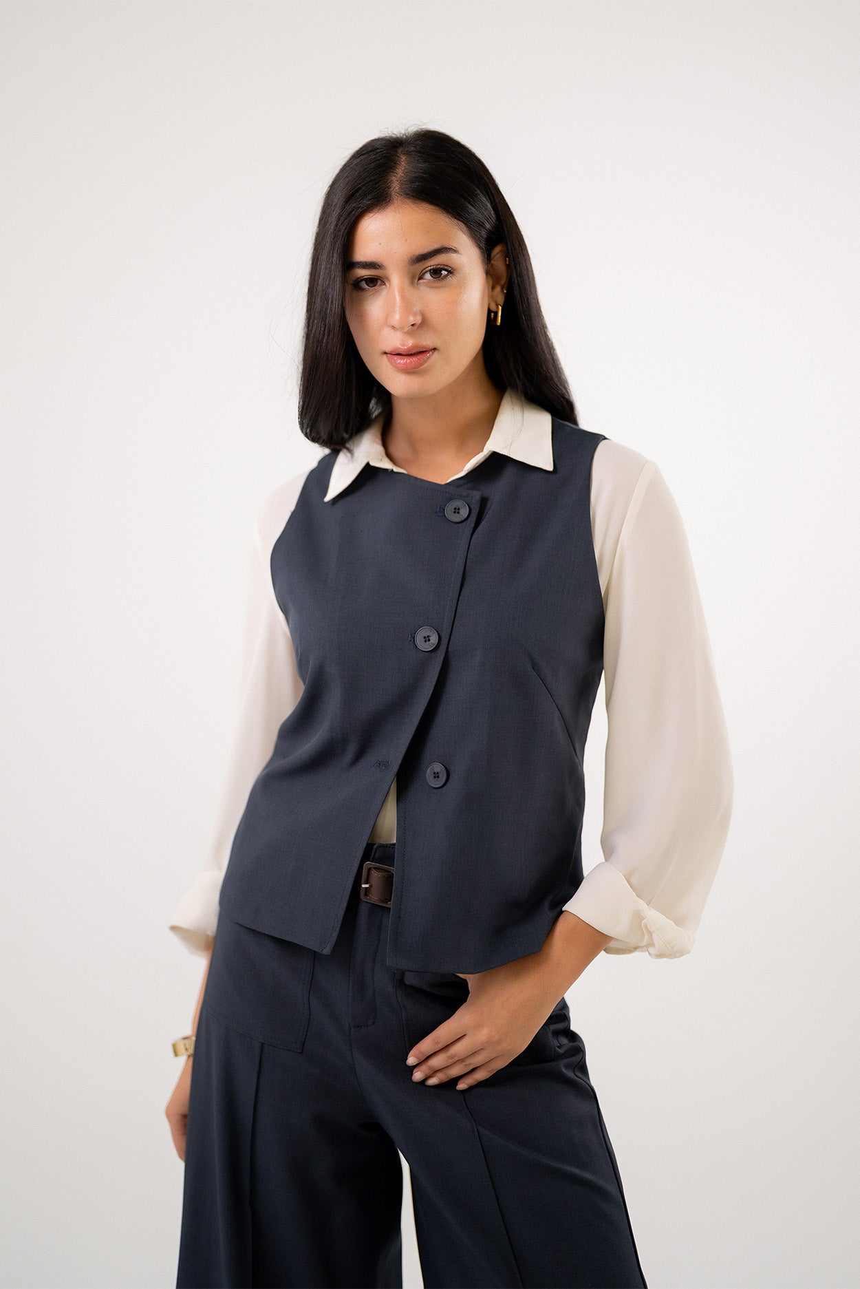 Crafted from smooth suiting fabric, this sleeveless vest features a structured cut with front buttons and a slightly flared hem for a clean, refined silhouette.Code :80513Material :TergalLength : RegularCare Instructions: Machine wash at max. 30ºC/86ºF with short spin cycle , Do not use bleach , Iron at a maximum of 110ºC/230ºF ,Do not dry clean ,Do not tumble dry