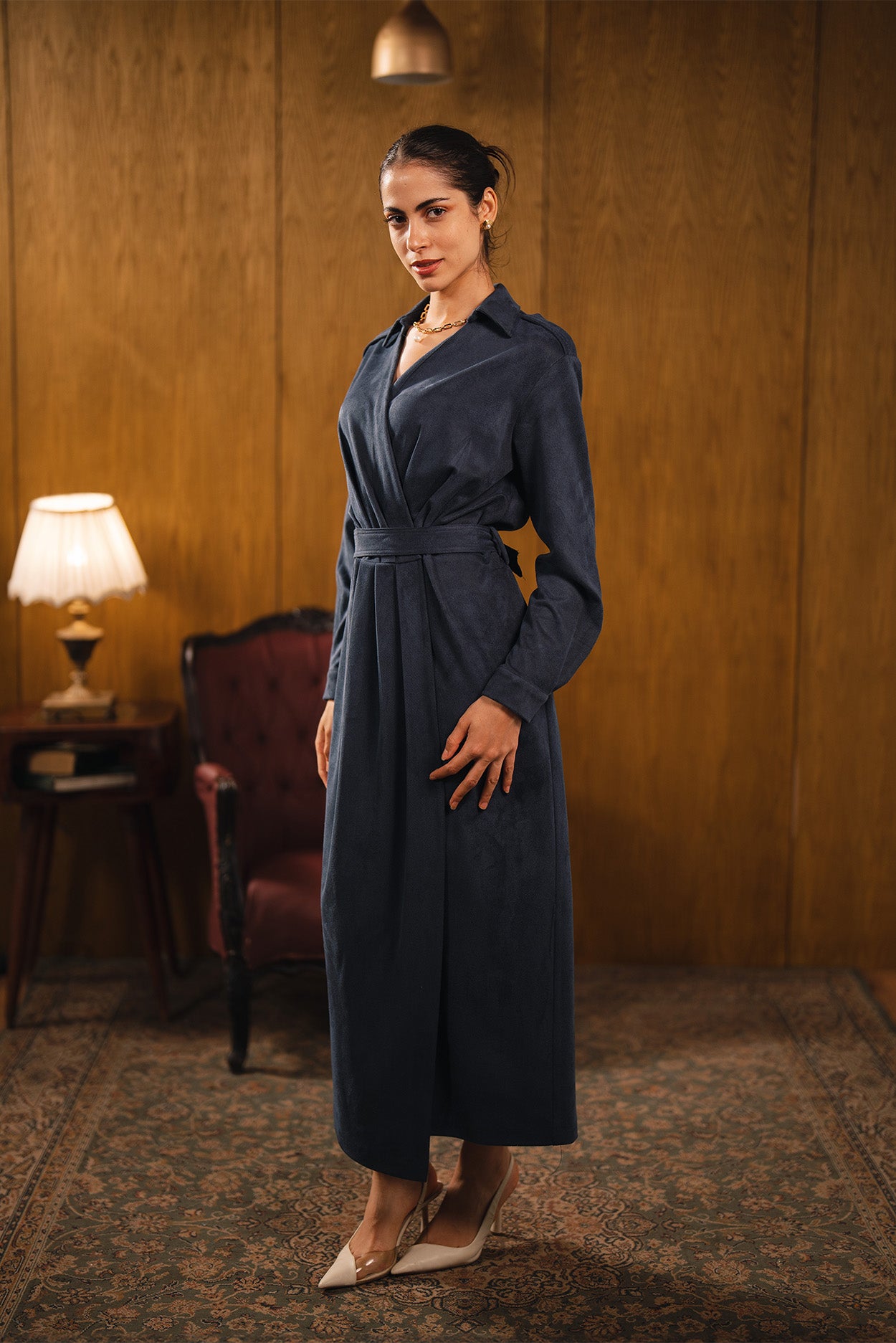 Soft, textured fabric, designed with a wrap-style front, gathered waist detailing, and a matching belt. Features a collared neckline, long sleeves, and a straight, ankle-length silhouette for an elegant, streamlined fit.Code :80547 Material :Suede Length : LongCare Instructions: Machine wash at max. 30ºC/86ºF with short spin cycle , Do not use bleach , Iron at a maximum of 110ºC/230ºF ,Do not dry clean ,Do not tumble dry